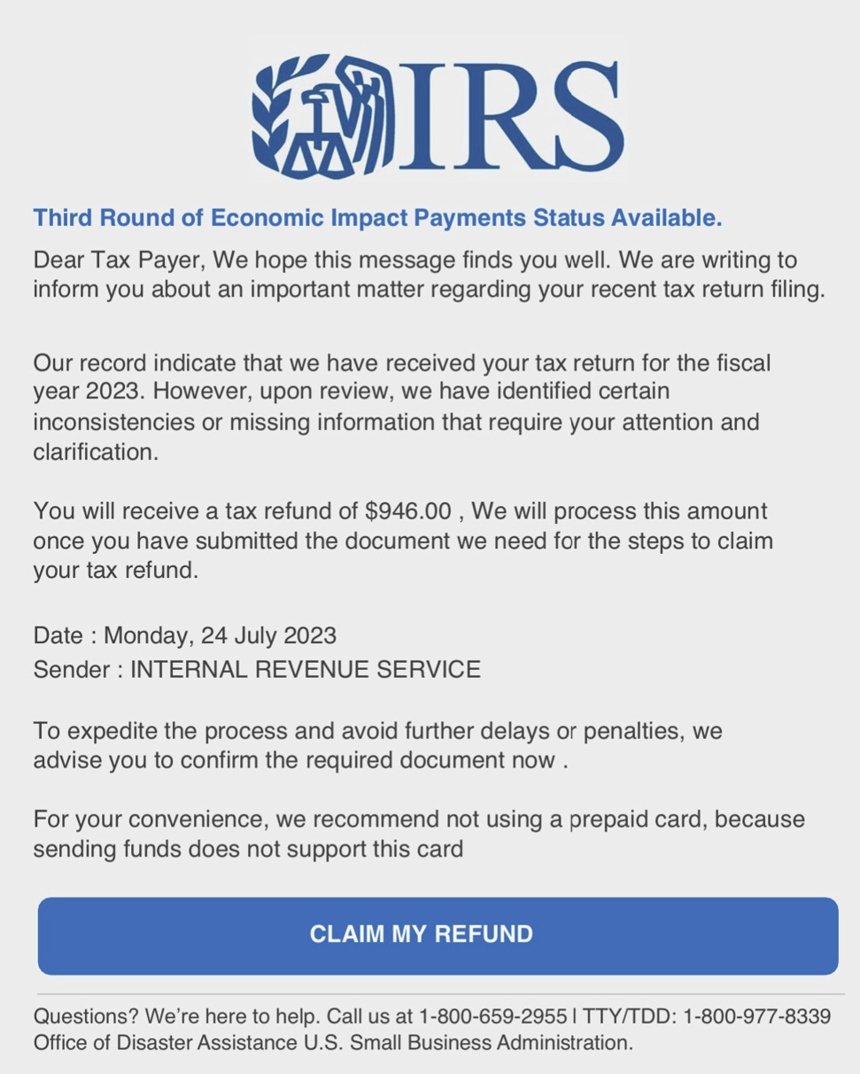 The bottom line is be careful if you ever get an email or text from the “IRS”.